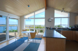 As in the first house, the view is dominant. We raised the roof with two shed dormers on the ocean side in order to gain larger windows. Under the new windows, along two living room walls, we added window seats; on the other walls we added cabinets and shelves. The seating arrangement was turned around to focus on a new stone fireplace and a more prominent view of the ocean. Dining was moved from a separate dining room to the living area. The kitchen was opened up and updated; the master bathroom was expanded to include a tub, tile shower, and sauna. The house now offers two experiences: the original mid-60s building retains its simple open stud aesthetic, while the newer wing offers a rich palette of finishes and a variety of places to settle among treasured objects. For more images of this house, visit Deck House Renovation.